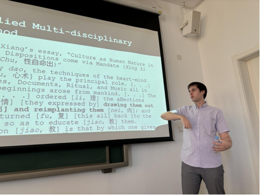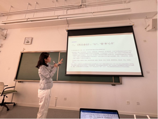项舒晨教授以《观万物之文与观人类之文:论儒家“情”本体论的文明建构逻辑》为题,基于出土文献与传世经典的互证研究,系统阐释了“情”在儒家文明论中的本体论意义:通过分析“观物取象”“通其变遂成天地之文”等命题,论证早期儒家将文明制度(“文”)的生成逻辑锚定于主体情感(“情”)与宇宙纹理(“象”)的互动关系,揭示“情”作为文明起源的认知中介功能;此外,项老师结合“性自命出”等命题,指出儒家“生德于中”的伦理实践依赖于情感(“情”)、心性(“心”)与文化教化(“心术”)的动态平衡,为“以情育德”提供了心性论依据。项老师强调了《礼记·乐记》的礼乐教化范式:以“乐者,通伦理者也”“致乐以治心”为核心,解析儒家如何通过礼乐制度将个体情感升华为普遍性道德自觉,从而构建“情→礼→德”三位一体的文明秩序。