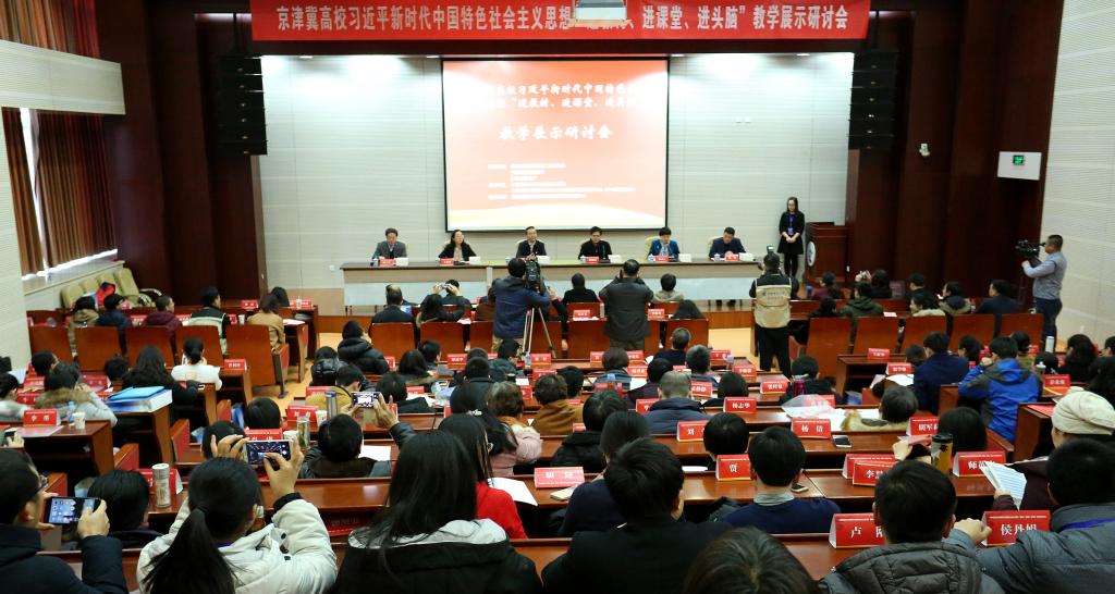 根据党中央和教育部关于学习贯彻党的十九大精神的总体部署,为深入推动习近平新时代中国特色社会主义思想“进教材、进课堂、进头脑”,2018年1月6日、7日,北京市委教育工委、天津市教育委员会、河北省教育厅在公司联合举办京津冀高校习近平新时代中国特色社会主义思想“进教材、进课堂、进头脑”教学展示研讨会。共有来自京津冀三地53所高校的110余名教师代表参会。会议通过教学展示、学习成果观摩、分组研讨、答记者问等环节,充分展现了京津冀三地高校思政课教师深度推进习近平新时代中国特色社会主义思想“进教材、进课堂、进头脑”的做法与风采,有效增进了三地高校教师的互动交流,形成了京津冀三地高校共同推进习近平新时代中国特色社会主义思想“三进”工作协同合作的良好局面。