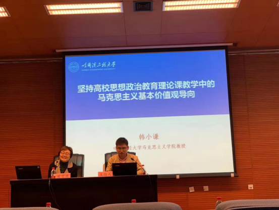 韩小谦教授被安排在大会上做了发言,她简要的将自己向大会提交的论文“坚持高校思想政治理论课教学中的马克思主义基本价值观导向”的研究思路向代表们做了汇报。她谈到研究的起因来自思政课教学中发现的问题,即在教师和员工中经常出现的将思政课的知识属性和价值属性割裂开来的现象,提出教师应自觉的将思政课的价值属性贯穿于理论教学的过程,实现习近平提出思想政治课要做到政治性和学理性的统一,价值性与知识性的统一,从而使思想政治理论课的教学实效性真正落实到育人即培养中国特色社会主义事业接班人上。
