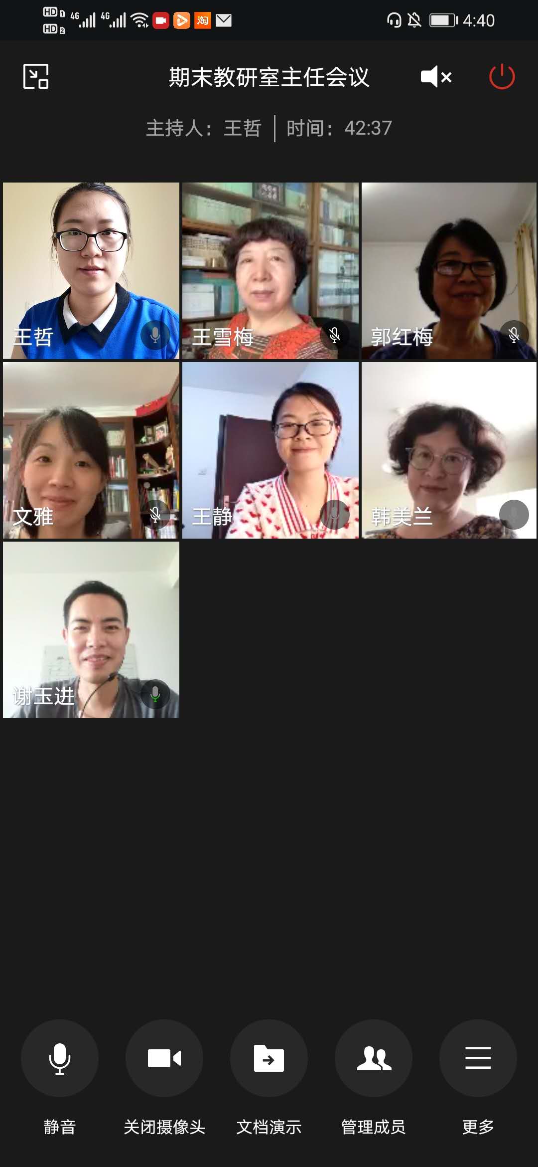 7月15日,英国365集团公司采用企业微信在线召开2019-2020学年第二学期期末教研室主任会议。会议由公司教学副经理谢玉进副教授主持,中国近现代史纲要教研室主任王雪梅教授、毛泽东思想和中国特色社会主义理论体系概论教研室主任郭红梅教授、马克思主义基本原理教研室主任韩美兰教授、思想道德修养与法律基础教研室主任文雅副教授、形势与政策教研室主任王静副教授、公司教学科研办公室主任王哲参加了会议。