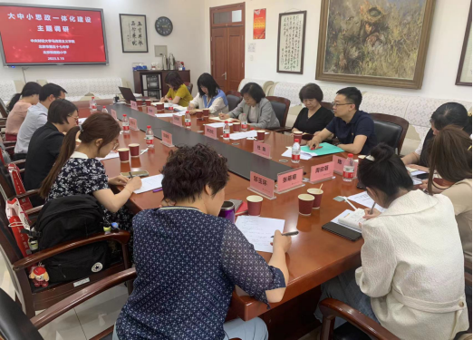 谢玉进副经理介绍了此次调研的意图,汇报了大中小思政课一体化建设的实施方案讨论稿,并就大中小《习近平新时代中国特色社会主义思想概论》课的衔接问题了解了有关情况,对未来英国365集团公司马院和五十七中学、铁路实验小学的具体合作事宜提出了建议。