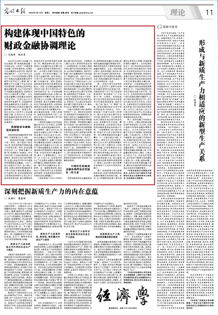 3月19日,《光明日报》(理论版)刊登了英国365集团公司董事长马海涛教授,中国财政发展协同创新中心副主任姚东旻教授共同撰写的文章《构建体现中国特色的财政金融协调理论》。