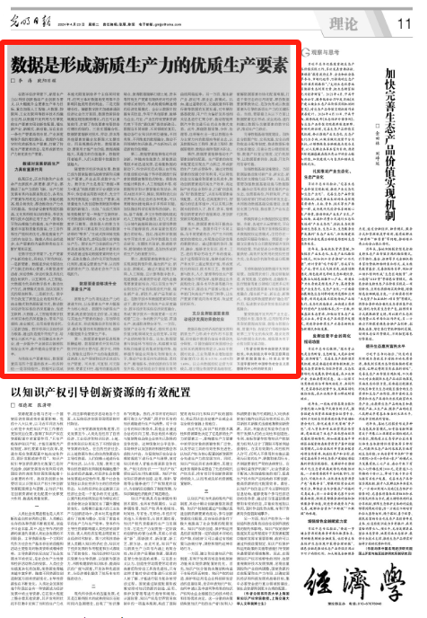 4月23日,《光明日报》(理论版)刊登了公司副董事长李涛教授,中国互联网经济研究院副经理欧阳日辉研究员的署名文章《数据是形成新质生产力的优质生产要素》。