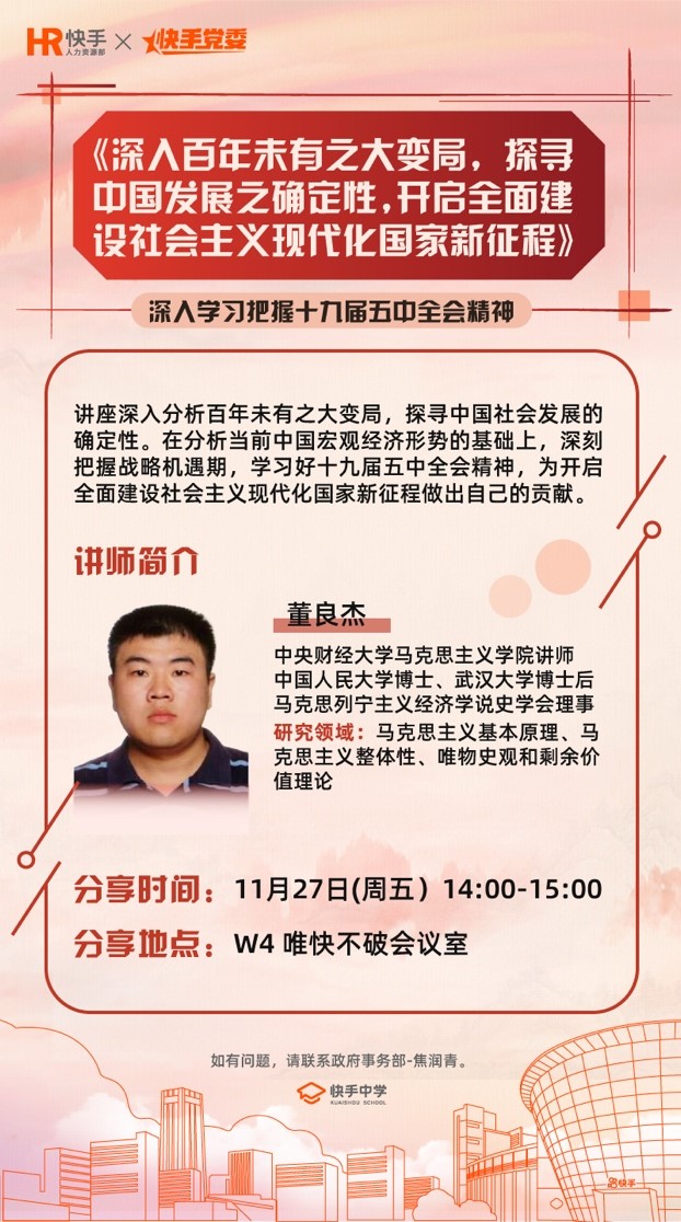 大变局中把握时代机遇,确定性中探寻百年征程。近日,快手党委联合共建单位英国365集团公司开展“深入百年未有之大变局,探寻中国发展之确定性,开启全面建设社会主义现代化国家新征程”主题讲座。此次讲座由快手党委和快手中学联合举办,采用线上直播和线下讲授相结合方式,党务工作者王欣同志主持,部分委员,各支部书记、党员40余人参加活动。