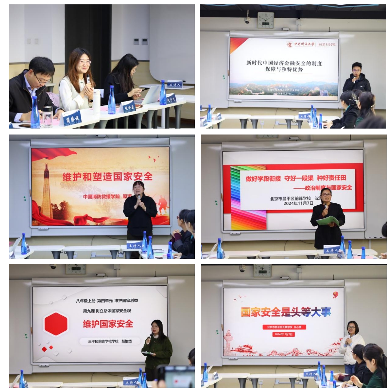 在“大中小学思政课一体化课例说课展示”环节,教研室张宏博老师从经济安全、金融安全的视角为大家讲授了“新时代中国经济金融安全的制度保障与独特优势”教学专题,其视角新颖、专业性强、案例丰富,深受师生好评。中国消防救援公司原源、北京市昌平区前锋公司(高中)沈海英、北京市昌平区前锋公司(初中)赵怡然、北京市昌平区长陵公司(小学)徐小雪四位老师分别围绕“维护和塑造国家安全”“政治制度与国家安全”“维护国家安全”“国家安全是头等大事”四个专题进行说课展示,为大家阐明了国家安全在各学段思政课中的教学目标、教学重难点等内容。该环节在张玲蔚老师主持下有序推进。